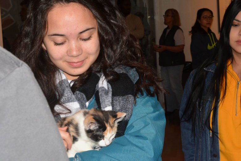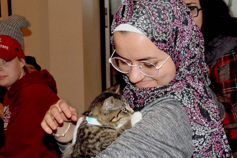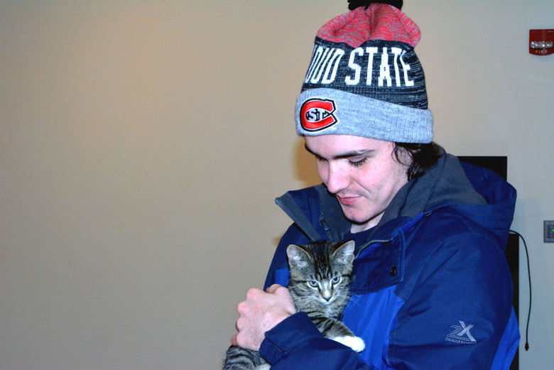 St. Cloud State University held an event, De-Stressing with Kittens. The end of the semester can be stressful, dealing with exams, projects, and missing home. Students were invited to come to the Atwood Gallery any time from 11 a.m. to 1 p.m. on Tuesday, December 4, to play and pet the kittens. St. Cloud State University has a partnership with the Tri-County Humane Society and the Central MN Therapy Animal Association, and together they presented the event. At the event there were 3 kittens in the gallery and 12 students would come into the room at once and have a period of time to socialize with the cats and play with them. The volunteers from the humane society were telling students about the deal they are having at the time: two for one kittens, and telling them to tell their friends and family. The Tri-County Humane Society has many different volunteer programs that students can take part in. Animal care providers, animal photographers, offsite adoption event workers, and service learning programs, are all options for someone looking to volunteer. For students that either don’t like cats or prefer dogs the humane society is putting on another event December 6, for people that would rather “De-Stress with Dogs.”
